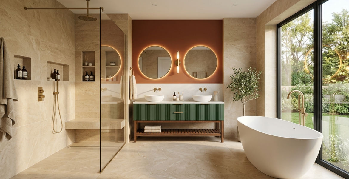 Navy vanities are having a moment. So are terracotta accent walls. These warm, saturated hues inject personality while maintaining the calming atmosphere bathrooms require.
